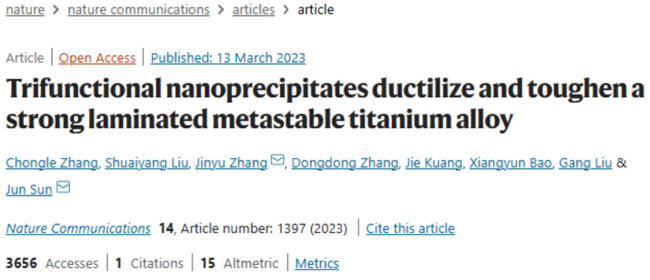 西交大孫軍院士、張金鈺教授團隊自主設計了Ti-1Al-8.5Mo-2.8Cr-2.7Zr(wt%)亞穩鈦合金,提出了少量的多形態硬質-塑性α納米析出相分布于亞穩態軟相β基體的新型異質疊層結構,并于2023年3月在國際著名期刊Nature Communications期刊上發表了題為《三重功能納米析出相塑韌化高強層狀亞穩鈦合金》(《Trifunctional nanoprecipitates ductilize and toughen a strong laminated metastable titanium alloy》)的相關成果,為優化鈦合金的強度和塑性提供了新的思路。