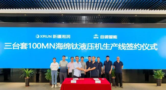 8月18日上午,合肥合鍛智能制造股份有限公司(以下簡稱“合鍛智能”)與新疆湘潤新材料科技有限公司(以下簡稱“新疆湘潤”)在合鍛智能簽訂了三臺套100MN海綿鈦液壓機生產線采購合同。該項目投產后,五江集團在新疆的高性能鈦及鈦合金新材料項目年總產能將達到7萬噸,規模位居世界前列。