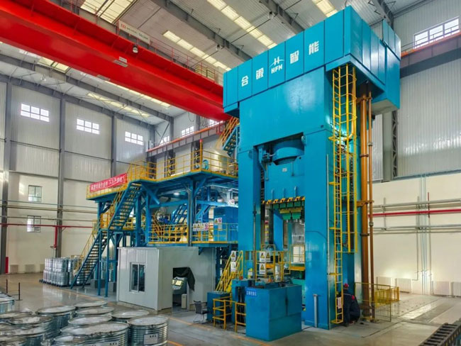 合鍛智能自主研制的海綿鈦電極擠壓成形自動化生產線,是目前國內同行業自動化程度最高、數控技術運用最全面的專用冷成形擠壓生產線之一,技術水平達到國內領先水平。操作者可通過壓機的全自動化設計,一鍵完成接料送料、電極壓制、自動出料、自動碼垛,不需要人工干預,有效節省人力。