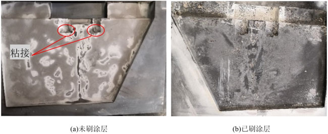 分別對未刷涂層和已刷涂層的兩組金屬模具安排鑄件澆注作業,鑄件冷卻出爐后清理,觀察兩組金屬模具的表面狀態。未刷涂層的金屬模具表面存在粘接現象,圓角處出現輕微粘接,輕微粘接的原因為模具型腔圓角偏小,澆注時被高溫鈦液融化,凝固收縮時應力釋放,導致型腔圓角處輕微粘接;已刷涂層的金屬模具表面殘留涂層顆粒,模具型腔表面完好無粘接。如圖3,由此可知金屬模具刷上涂層后,可以很好地保護模具的型腔表面,有效防止高溫鈦金屬液對型腔壁的熱蝕和沖擊,提高金屬模具的使用壽命。