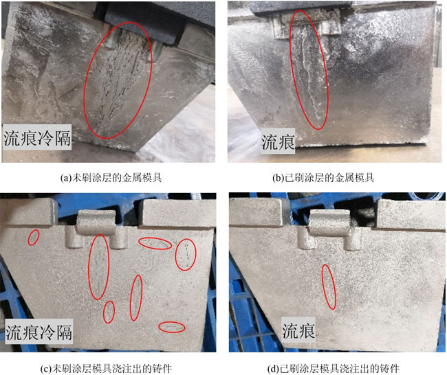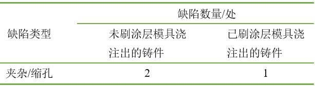未刷涂層模具澆注出的鑄件,內部縮孔缺陷有2處;已刷涂層模具澆注出的鑄件,內部夾雜缺陷有1處。涂層與金屬型模具結合力較好,鑄件沒有出現掉渣情況,內部質量良好。