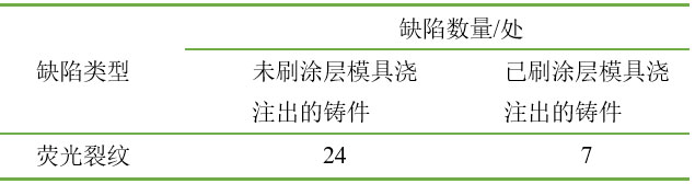 鈦合金鑄件熱等靜壓后進行熒光檢測,缺陷數量統計見表1。未刷涂層模具澆注出的鑄件表面熒光缺陷共24處,已刷涂層模具澆注出的鑄件表面熒光缺陷共7處。已刷涂層模具澆注出的鑄件比未刷涂層模具澆注出的鑄件,表面缺陷減少約70%,說明金屬模具刷上涂層是可以有效改善鑄件的表面質量。