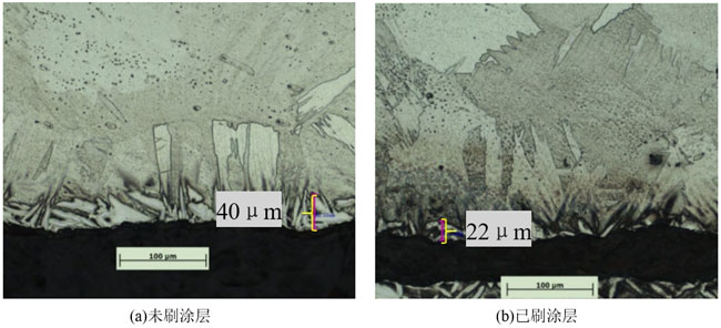?、莆此⑼繉咏饘倌>邼沧⒊龅蔫T件表面擴散層厚度,與刷過涂層金屬模具澆注出的鑄件相當,均小于0.05 mm。