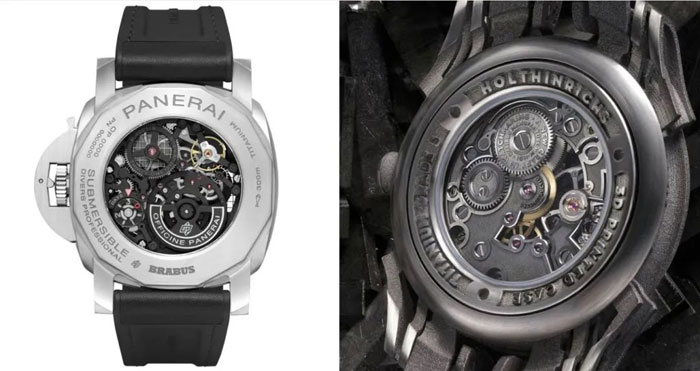△2023年Panerai發布了配備3D打印鈦金屬表殼的Submersible S Brabus PAM01283,右圖為Holthinrichs Deconstructed推出了首款3D打印鈦金屬手表
