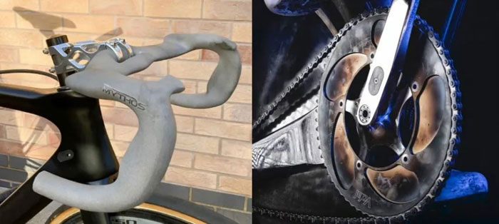 △自行車公司Mythos為客戶提供一系列3D打印鈦零件,包括這些車把,而Verve Cycling(右)則提供了新的3D打印鈦曲柄。