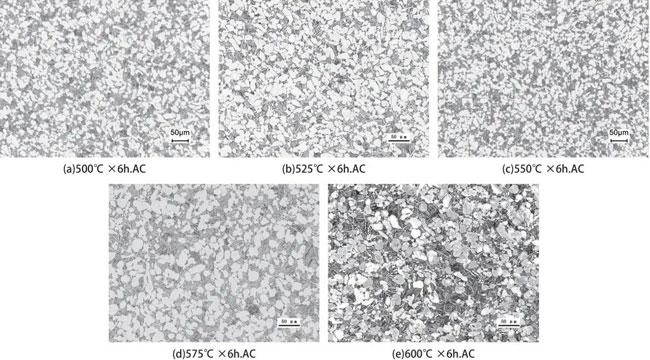 ⑴TC20鈦合金鍛棒在固溶時效處理后為典型的混合組織,并且隨著時效溫度的不斷升高,次生α相的形態由細針狀逐漸轉變為板條狀,發生熱激活下的粗化現象。