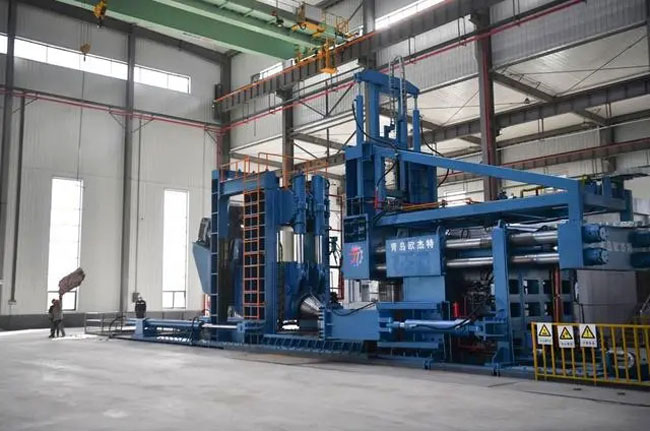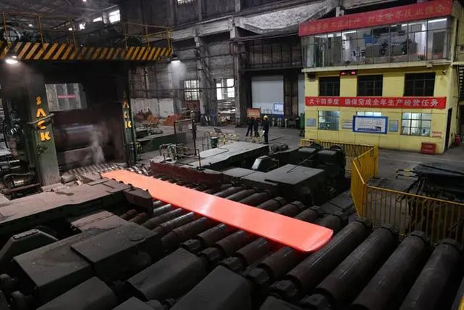 寶鈦集團寬厚板材料公司3.3米四輥可逆式熱軋機組生產線正在軋制鈦鋼復合板。(受訪者供圖)