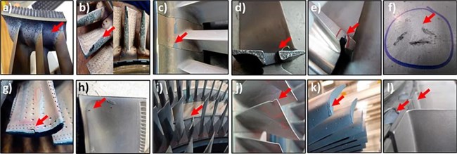 圖1所示:需要修復處理的發動機部件失效(a)低壓渦輪葉片腐蝕點蝕缺陷,(b)高壓渦輪葉片燒蝕,(c)砂眼和涂層脫落,(d)葉根微動磨損,(e)葉槽劃痕缺陷,(f)由于深劃痕造成的劃痕缺陷,(g)葉尖開裂,(h)葉片翼型開裂,(i)葉片斷裂,(j)外力沖擊導致葉片彎曲,(k)由于異物撞擊,葉片尖端有嚴重毛刺;(l)根部深壓痕。
