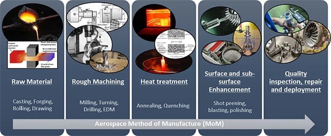 無論是常規工藝還是非常規工藝,其制造過程中所經歷的載荷條件都會對其疲勞壽命產生重大影響。選擇一種既能提高材料疲勞壽命又能滿足表面光潔度要求的方法是一項相當大的挑戰。產生殘余應力的制造工藝可能會對材料的表面紋理產生不利影響,而產生光滑紋理的技術可能不會產生必要的壓應力。因此,該材料在功能應用中使用之前必須經過多種加工方法。在航空航天工業中,整個制造過程通常被稱為制造方法(MoM)。因此,選擇具有成本效益的制造和維修方法對于可持續實踐至關重要。