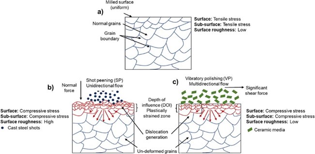 噴丸強化是一種使材料塑性變形并細化表面和次表面晶粒結構,從而產生影響深度(DOI)的過程。通過表面和次表面的塑性變形引入壓應力,通過抵抗裂紋的萌生和擴展來改善疲勞性能。然而,噴丸強化會產生波動和高表面粗糙度,從而顯著影響部件的疲勞壽命。對于有氣流的旋轉航空部件,如渦輪葉片,均勻的表面粗糙度對于氣流產生至關重要。因此,噴丸組件經過最后一步的精細拋光,以達到所需的表面粗糙度。振動拋光是一種以可控速率均勻地從表面去除材料并產生光滑紋理的批量拋光工藝。該工藝降低了表面粗糙度,同時保留了表面和次表面的壓應力和晶粒細化。因此,低表面粗糙度和壓應力,再加上精細的晶粒結構,提供了對作用在部件上的應力的優異抵抗,從而延長了使用壽命。