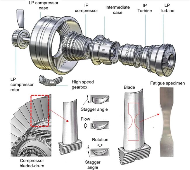 圖4所示:燃氣渦輪發動機的示例顯示了壓氣機葉片的細節和用于試驗程序的疲勞試樣。