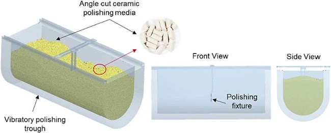 噴丸強化后,試樣采用振動拋光進行表面拋光,這是一種大規模拋光工藝。為了實現這一點,研究團隊使用了ERBA EVT135,將試件放置在介質流動方向,以最大限度地提高激振力,如圖5所示。拋光過程完成后,將樣品從機器中取出并用超聲波清洗以去除任何殘留顆粒。