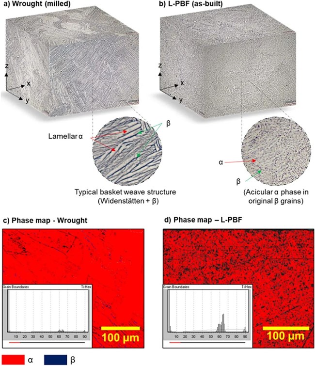 圖7所示:(a)經過銑削的鍛造試樣,(b)激光粉床熔融增材制造(未經后處理)試樣的三維顯微結構圖,(c)鍛造試樣,(d)激光粉末床熔融Ti-6Al-4V材料的相圖。