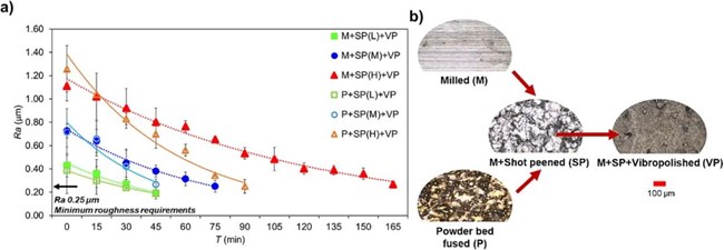 圖8所示:(a)拋丸試樣振動拋光過程中評估輪廓(Ra)演化的算術平均偏差,(b)各種制造工藝后的表面圖像。