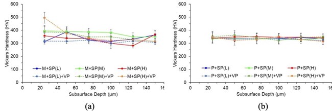 圖10所示:(a)鍛造和(b)L-PBF試樣的表面顯微硬度,比較了噴丸和振動拋光條件。