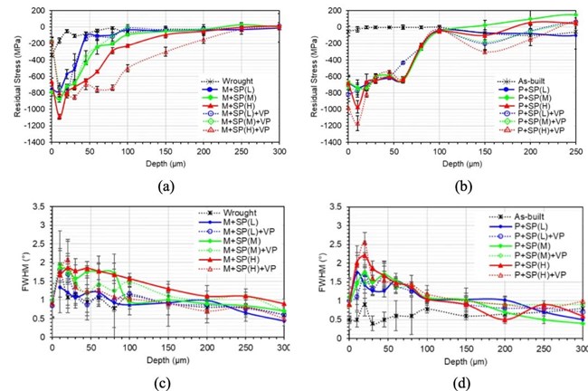圖11所示:(a)鍛造、(b)L-PBF試樣和(c)鍛造、(d)噴丸和噴丸+振動拋光條件下L-PBF試樣的殘余應力。