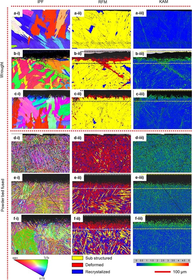 EBSD表征的晶粒結構變化如圖12所示。EBSD顯微結構圖提供了形變和再結晶晶粒的詳細信息,以及航空航天MoM后表面和次表面塑性應變的平均核位錯(KAM)圖。逆極圖(IPF)清晰地描述了α六邊形閉包結構,晶粒間取向偏差最小(<2°)。如圖12a-ii和a-iii所示鍛造的試樣表面沒有變形、再結晶和塑性應變。然而,在噴丸強化(圖12b,e)和振動拋光(圖12c,f)之后,觀察到明顯的變化,包括表面和亞表面區域的嚴重晶粒變形。變形歸因于噴丸強化過程的高速沖擊,導致鍛造和L-PBF試樣的DOI分別為15μm和20μm。將圖11的殘余應力結果與DOI進行對比,可以推斷試件的力學特性得到了改善。