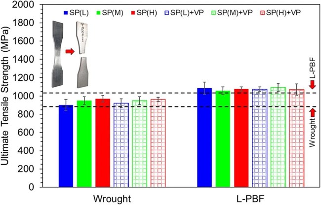 圖13所示:噴丸強化和噴丸強化+振動拋光后鍛造和L-PBF試樣的拉伸性能。