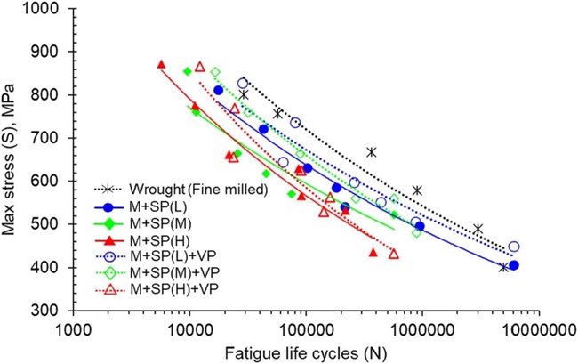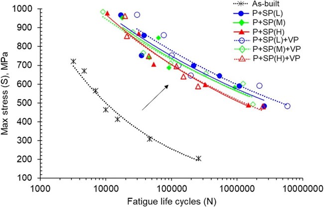 圖16所示:采用不同制造方法(僅增材制造未經后處理、噴丸、噴丸+振動拋光)后激光粉末床熔融Ti-6Al-4V試樣的疲勞行為。