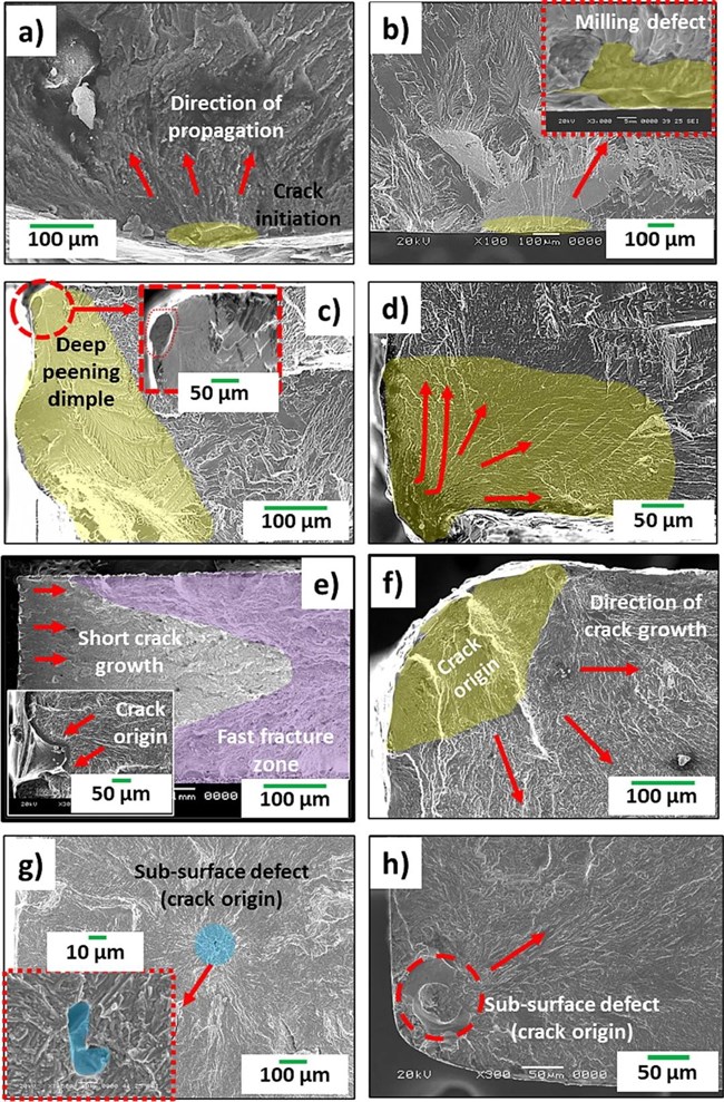 圖15所示:(a-d)鍛造Ti-6Al-4V試樣斷口在表面萌生裂紋,(e-h)L-PBF Ti-6Al-4V試樣斷口在表面和次表面萌生裂紋。