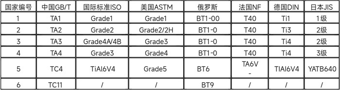 國內牌號主要有:TA1、TA2、TA3、TA4、TA5、TC4、TC6、TC11;