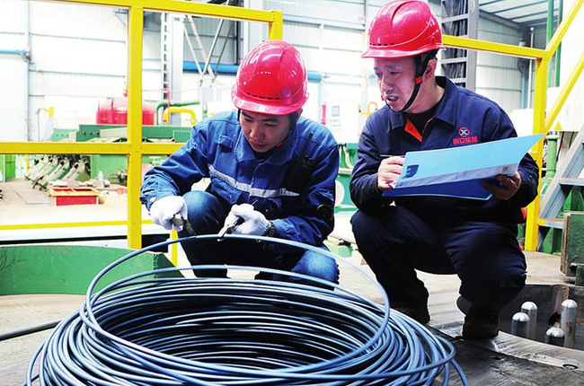 該公司位于寶雞高新區八魚鎮姬家殿工業園,是一家以鈦及鈦合金為主的稀有金屬研究、加工、制造以及大單重鈦、鈦合金棒材、線材軋制生產及加工為一體的高新技術企業,公司長期致力于鈦及有色金屬復合材料熱鍛軋制工藝的探索與研究,產品廣泛應用于3C、3D打印、精細化工、石油化工等行業。走進該公司的生產車間,只見設備高速運轉,一根根直徑100mm的鈦材棒坯經過加熱、軋制、精軋等工序,變為直徑僅為7.8mm的盤卷后,工人正在對產品進行初步質檢。“去年公司投入1800萬元引進先進設備,建成一條鈦及鈦合金棒材精軋生產線,大幅提升了鈦絲、鈦棒等核心產品的加工效率及產品質量。”該公司負責人茹洋介紹道,新生產線啟用后,日產能由原本的3噸提升到了10噸左右,效率顯著提升的同時,成品率也上升了5到10個百分點。