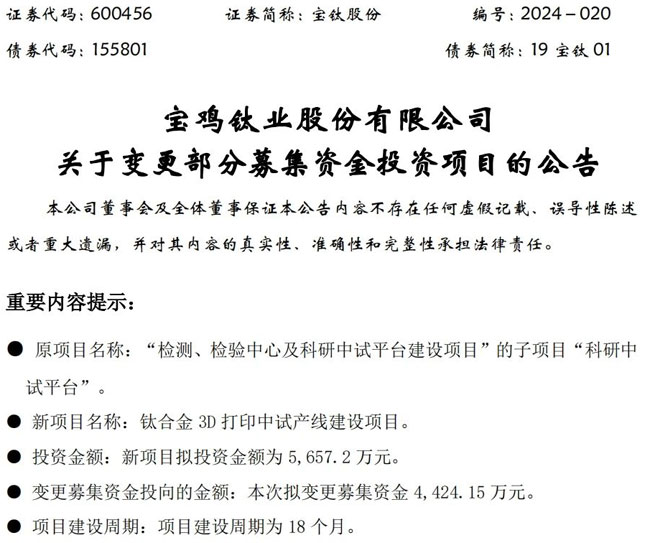 2024年6月14日,南極熊獲悉,年營收近70億、總市值超120億的寶鈦股份(SH 600456)發布公告稱,公司擬變更的募投項目為“檢測、檢驗中心及科研中試平臺建設項目”的子項目“科研中試平臺”。本次將該項目未使用剩余募集資金4424.15萬元投向進行變更,變更后的募集資金用于“鈦合金3D打印中試產線建設項目”。此次變更投向的募集資金占原“科研中試平臺”募集資金承諾投資額的97.88%,占公司本次非公開發行募集資金凈額的2.25%。
