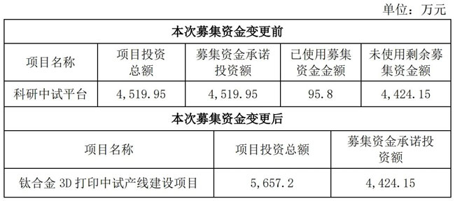 綜上,結合公司發展實際和市場需求,綜合考慮公司現有產業結構、項目建設情況等相關因素,經審慎評估,為控制募集資金投資風險,合理利用募集資金,公司擬變更原項目募集資金投向,將原“科研中試平臺”建設項目變更為“鈦合金3D打印中試產線建設項目”,以提高募集資金使用效率。
