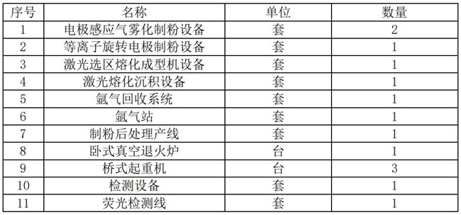 備(3D打印鋪粉設備)1套,激光同軸送粉設備1套;配套真空退火爐、橋式起重機等輔助配套設備設施。項目建成達產后新增鈦及鈦合金球形粉126.25噸/年,