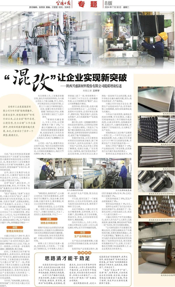 興盛新材2024年7月30日榮登,寶雞日報(bào)第8版專題刊為“混改讓企業(yè)實(shí)現(xiàn)新突破”。針對于興盛上半年重點(diǎn)工作、產(chǎn)品突破、理念轉(zhuǎn)換、等做了詳細(xì)的采訪工作。