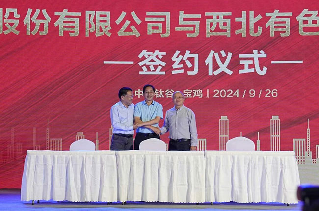 巨成鈦業股份有限公司董事長羅建輝分別和西北有色金屬研究院、攀鋼集團沈陽鈦金屬新材料有限公司簽訂戰略合作協議。
