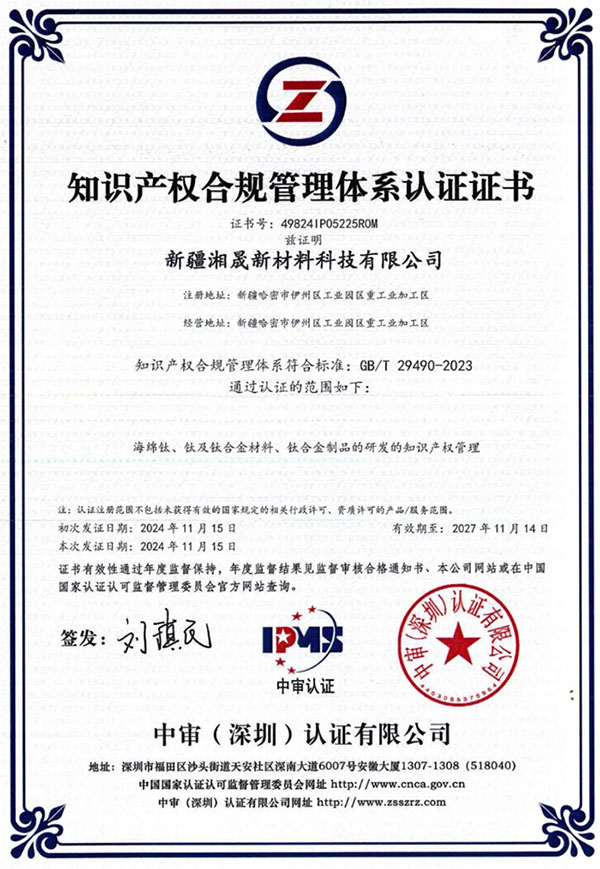 新疆湘晟新材料科技有限公司為湖南五江控股集團在西北地區投資設立的集研發、生產于一體的大型鈦及鈦合金新材料高新技術產業公司,擁有國內一流、國際先進的鈦及鈦合金生產裝置、檢測技術和一流的人才隊伍。主要產品包括:海綿鈦、鈦及鈦合金鑄錠、帶材、板材、鍛材、棒材、復合材等,是全國首家集“鈦礦-海綿鈦-鈦加工材-鈦制品”為一體的全鈦產業鏈企業。在未來的發展道路上,湘晟科技將繼續依托知識產權合規體系,不斷創新進取,以用戶需求為導向,提供更加優質的產品和服務鏈。