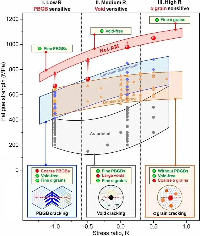 3D打印,又名增材制造(Additive manufacturing,AM),憑借在復雜金屬構件上得天獨厚的自由成形能力,極大地滿足了新一代航空裝備對輕量化、高集成度的重大需求,有望替代傳統制造方法實現高端裝備關鍵構件的智能制造。不過,這一巨大的應用前景長期以來受制于增材制造材料及構件普遍較差的疲勞性能。為解決3D打印材料抗疲勞的國際難題,2024年2月中國科學院金屬研究所材料疲勞與斷裂團隊與鈦合金團隊合作提出了組織與缺陷耦合調控的NAMP工藝,成功制備出具有超高拉-拉疲勞性能的近無微孔3D打印Ti-6Al-4V合金材料(Nature,2024),突破所有材料拉-拉比疲勞強度世界紀錄,更新了人們以往對3D打印材料疲勞性能不高的固有認識。然而,實際工程構件的服役環境一般非常復雜,常常伴隨著加載應力比的顯著變化。當材料或構件所承受的外部應力比變化時,循環應力幅值和最大應力的分配比例也隨之改變,進而誘發不同疲勞開裂機制之間的轉變。這種“此消彼長”的開裂規律使得傳統鈦合金組織難以在全應力比范圍內均保持優異的疲勞性能,一種顯微組織類型往往僅在特定應力比范圍內表現出抗疲勞優勢(圖1)。尤其是對于具有復雜結構的增材制造構件,其實際服役過程中的應力分布更為復雜,不可避免地會承受具有多變應力比的疲勞載荷。因此,如何實現全應力比條件下的高抗疲勞能力是決定增材制造技術能否在航空航天等領域規模化應用的關鍵,也是亟待解決的科學難題之一。