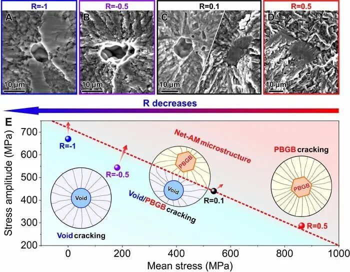圖2.Net-AM組織Ti-6Al-4V合金在不同應力比下的典型疲勞斷口和對應的疲勞裂紋萌生機制。(A)應力比R=-1:微孔缺陷開裂;(B)應力比R=-0.5:微孔缺陷開裂;(C)應力比R=0.1:微孔缺陷開裂和顯微組織開裂共存;(D)應力比R=0.5:顯微組織開裂;(E)應力比變化,Net-AM組織Ti-6Al-4V合金疲勞裂紋萌生位置轉變及其對應的疲勞強度變化示意圖。