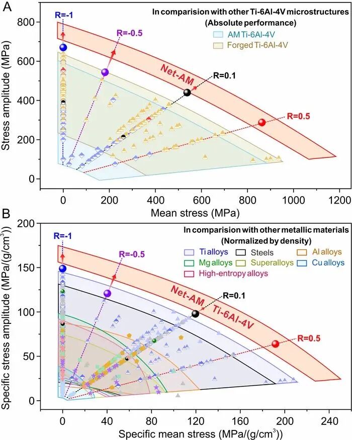 圖3.與其他Ti-6Al-4V合金和常見的金屬結構材料相比,Net-AM組織Ti-6Al-4V合金在不同應力比下的疲勞強度分布。(A)應力幅vs平均應力;(B)材料密度歸一化的疲勞強度vs材料密度歸一化的平均應力。