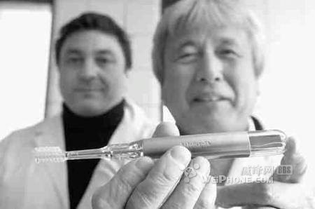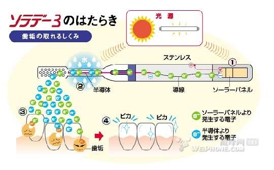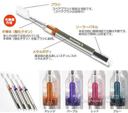 鈦金屬太陽能牙刷”。該牙刷只需要受到光線照射,牙刷手柄就能釋放出負極電子,吸取牙菌膜的正極電子,產生氧化作用。而刷牙時產生的唾液帶有負極電子,可分解牙菌膜,這樣就達到了清潔口腔的效果。由于擔心前一代產品Soladey-J3X進入口腔之后沒有足夠的光線導致牙刷功能失效,這次新的產品加入了太陽能蓄電池,用于加速電話反應。小宮山邦夫博士介紹說這個新的牙刷清潔功效是之前產品的2倍。