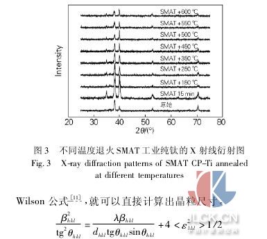 圖3為不同溫度退火smat工業純鈦的x射線衍射圖。通常認為寬化的bragg衍射峰是由晶粒細化寬化峰、微觀應力寬化峰和儀器寬化峰三者疊加而成。考慮到不同試樣的儀器寬化效應不變,所以根據β2=β2m-β2s(其中β為由晶粒細化和微觀應變引起的寬化,βm為實測寬化,βs為儀器寬化) 計算實際寬化。x射線衍射儀器寬化由標準sio2標樣校正。由scherrer-wilson公式[11],就可以直接計算出晶粒尺寸。