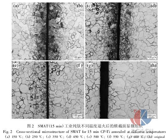 圖2為smat 15min工業純鈦不同溫度退火后的橫截面顯微組織。由圖2可以看出,退火溫度直到350℃時,表面納米化工業純鈦的表層組織都沒有明顯的變化,但在過渡的形變孿晶區的孿晶密度降低。繼續升溫至450℃時,劇烈變形區材料發生了明顯的回復和再結晶,形成了界面清晰的等軸晶,過渡的變形孿晶區還有孿晶存在。經500℃退火后,劇烈變形區晶粒進一步長大,但比基體晶粒尺寸小很多。經550℃和600℃退火后,表層晶粒和基體組織形貌已經沒有區別。