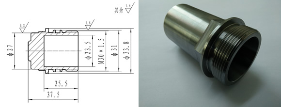 旋轉類零件如某螺塞零件,最大外圓直徑為φ33.8,材料為TC4,原材料選用φ30棒材。零件采用一次車削加工完成(如圖1)。為了保證零件加工精度,加工設備選用了進口數控車床,其主軸轉速最高6000轉/分,主軸跳動小于2μm,加工時主軸震動極小加工穩定性好,冷卻液可由3個方向噴出,冷卻充分。