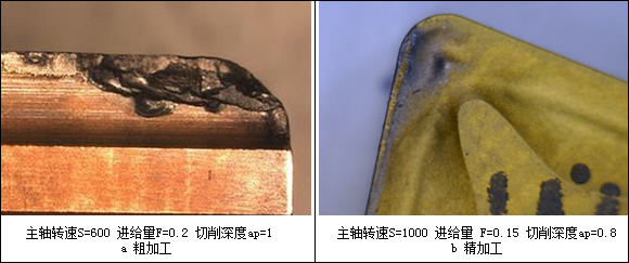 進行外圓車削時,初期選用了某知名品牌硬質合金涂層刀具,按照廠家推薦的切削參數進行加工。由于零件來料狀態為圓棒料,表面有熱處理氧化層,加工時刀具的邊界磨損嚴重,致使加工10——15件零件刀具就產生不同程度的磨損及崩刃現象(如圖2),無法滿足批量生產的加工需求。