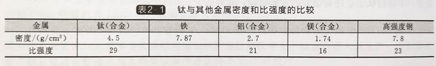 表2-1鈦與其他金屬密度和比強度的比較
