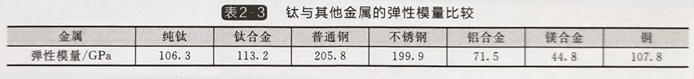 表2-3鈦與其他金屬的彈性模量比較
