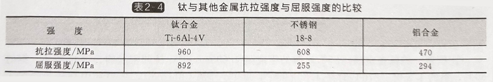 表2-4鈦與其他金屬抗拉強度與屈服強度的比較