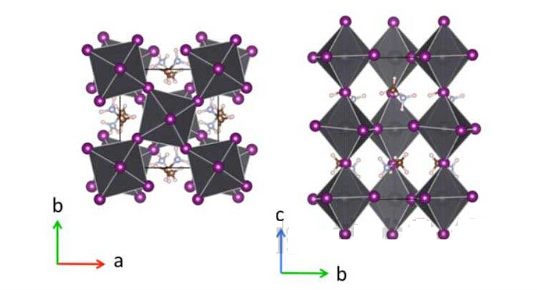 目前,特別研究小組正在探索鹵化金屬鈣鈦礦型太陽能電池的代表——甲基氨基碘化鉛(CH3NH3PbI3,圖1)等太陽能電池的制造方法。小組負責人白井康裕介紹說:“我們在考慮離子性晶體的化學方面的問題的同時,使用通常的固體物性的研究方法和計測手段,對使用鹵化金屬鈣鈦礦的太陽能電池為何具有高效率等高性能發揮機制展開了研究。”