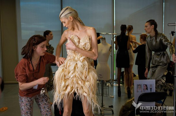時尚模特兒黛文?溫莎準備在巴黎「時尚設計城」的成衣展中走秀。她身上穿的3D打印洋裝是一名時裝設計師和一名建筑師的合作結晶。時尚模特兒黛文?溫莎準備在巴黎「時尚設計城」的成衣展中走秀。她身上穿的3D打印洋裝是一名時裝設計師和一名建筑師的合作結晶。