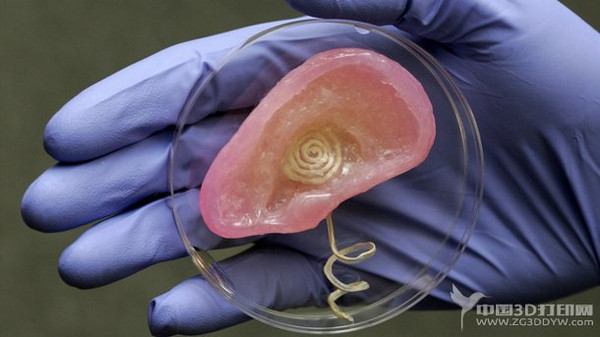 這是普林斯頓大學的研究人員以聚硅氧和軟骨細胞為「墨水」3D打印出的仿生耳。金屬線圈負責收發可以刺激聽神經的電脈沖,就和人工電子耳一樣。