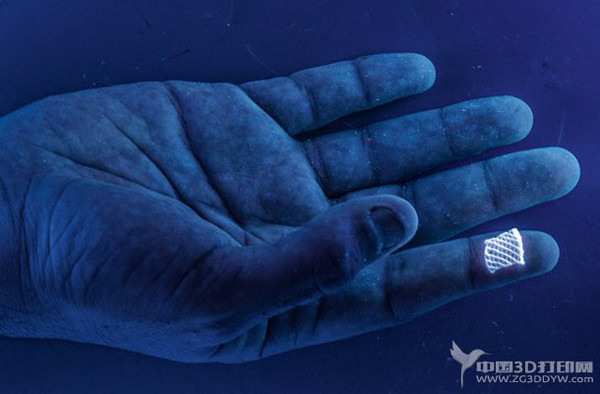 這個在紫外光下發出光芒的「支架」由哈佛大學實驗室制作,制作方式與利用生物墨水以3D打印出血管密布的活體組織的方法類似。研究人員希望這樣的努力最后 能導向可打印的活體組織,并以這些組織進行藥物篩選、再生,最終是器官移植。這個在紫外光下發出光芒的「支架」由哈佛大學實驗室制作,制作方式與利用生物 墨水以3D打印出血管密布的活體組織的方法類似。研究人員希望這樣的努力最后能導向可打印的活體組織,并以這些組織進行藥物篩選、再生,最終是器官移植。