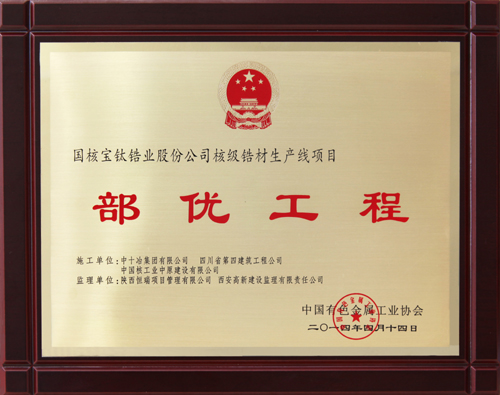 核級鋯材生產線項目于2012年至2013年經過交工驗收、創優申報、初次審核、現場復審、綜合評審、審定等多個環節,最終被評審組評選為“有色金屬工業(部級)優質工程”,并被有色金屬工業建設工程質量監督總站推薦申報“國家優質工程”。