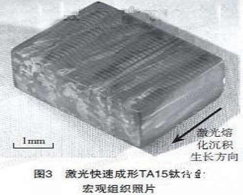 材料的組織結構是影響機械加工工藝的重要因素之一。圖3為激光快速成形TA15鈦合金沿沉積生長方向的縱截面宏觀形貌,從圖中清晰可見與表面“魚鱗紋”狀形貌相對應的逐層熔化沉積痕跡。進一步的高倍顯微組織分析表明(圖4),激光快速成形TA15鈦合金具有超細“網籃狀”特殊顯微組織,其α片層細小、片層集束取向隨機多樣,具有快速凝固組織特征,這是激光快速成形鈦合金具有優異綜合力學性能的凝固組織基礎。