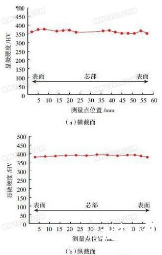 材料硬度是影響其切削加工工藝的重要因素之一,激光快速成形TA15鈦合金材料橫截面和縱截面顯微硬度分布如圖5所示??梢钥闯?,顯微硬度值分布均勻穩定,為HV350~HV400。